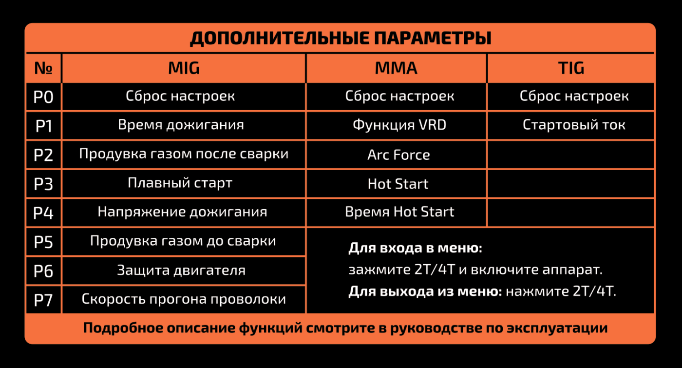MIG: сброс к заводским настройкам, время и напряжение дожигания проволоки, продувка газом до и после сварки, плавный старт, защита двигателя от перегрузки, скорость прогона проволоки;
