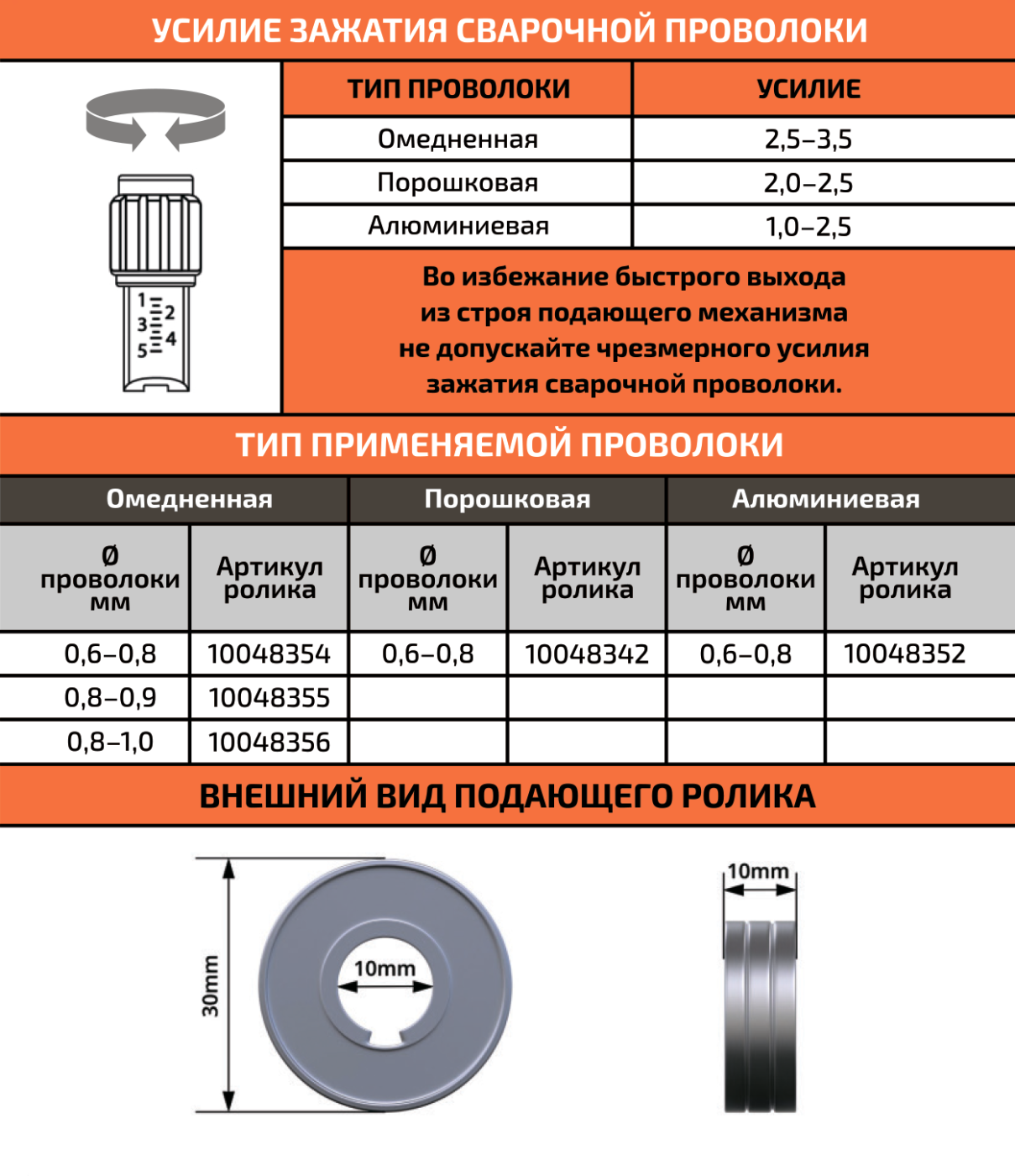 Максимальная защита аппарата от: перегрузки по току, превышения тока короткого замыкания, ограничения по мощности, перегрузки механизма подачи проволоки и перегрева силовой части.